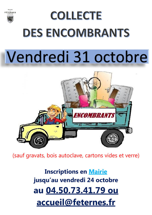 Un passage pour le ramassage des encombrants est prévu le 31 Octobre. Les inscriptions sont possible jusqu'au 24 octobre.