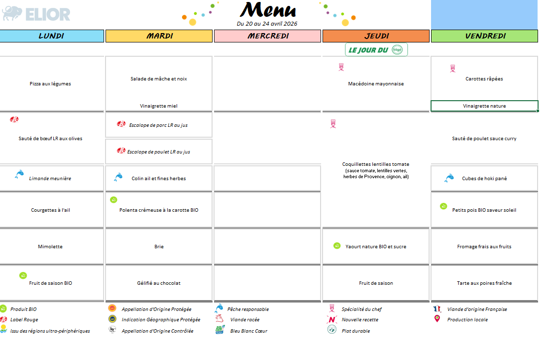 Menu du restaurant scolaire du 20 au 24 avril 2026