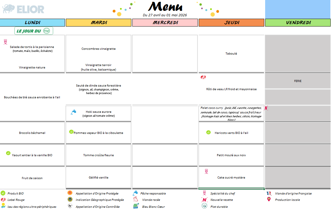 Menu du restaurant scolaire du 27 avril au 01 Mai 2026