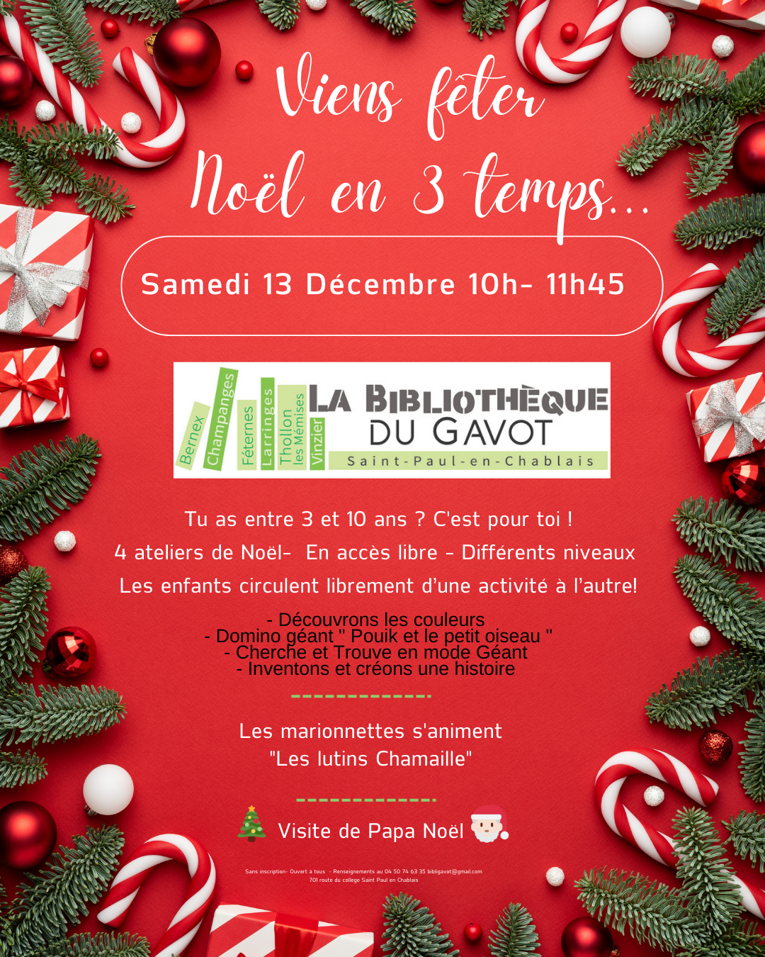 La Bibliothèque du Gavot organise un évènement pour Noël le samedi 13 décembre de 10H à 11H45.